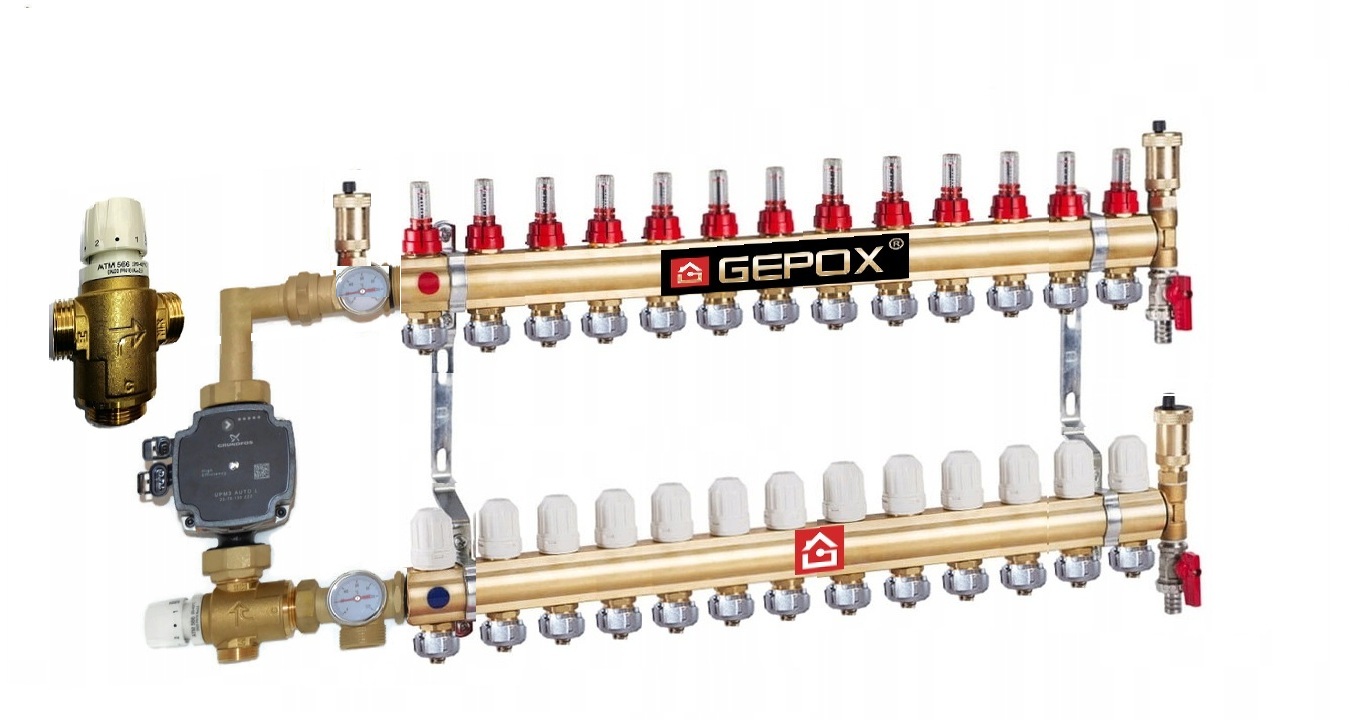 Rozdzielacz do podłogówki 12 obwodów GEPOX mosieżny do ogrzewania podłogowego